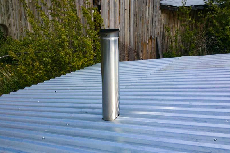 Снаружи, на кровле, стык дымохода и крыши нужно тщательно изолировать от дождя. Применяются специальные потолочно-кровельные проходки и фартуки. Проще всего герметизировать прорез в кровле с помощью эластичного фланца подходящего диаметра – это конус из термостойкой резины, который надевается на трубу и крепится к крыше саморезами. Верхний край фланца герметично обжимается вокруг трубы стяжным хомутом. Также вокруг трубы монтируют металлический фартук (примыкание) под листы кровли, чтобы отводить воду. Все эти узлы лучше продумать заранее, еще при установке обрешетки, вырезав отверстие нужного размера.